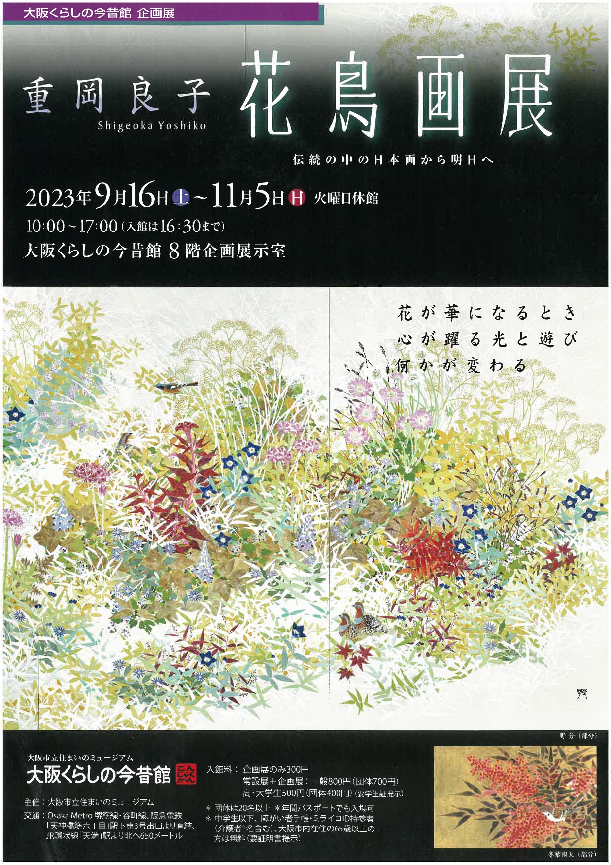 現代日本画家・重岡良子氏は、花鳥画を通して文化を継承することを意識しながら、数十年にわたって山野に咲く花や小鳥の写生を積み重ね、装飾性を持たせた屏風絵の数々を発表してきた。当館では令和3年4月から6月にかけて重岡氏の作品の中から「春夏」の画題を展示。今回はその続編として「秋冬」をテーマに新作の屏風3点も交えて展示する。本展を通じてより気軽に絵画に親しみ、花鳥のモチーフを現代の暮らしに取り入れる提案も行う。