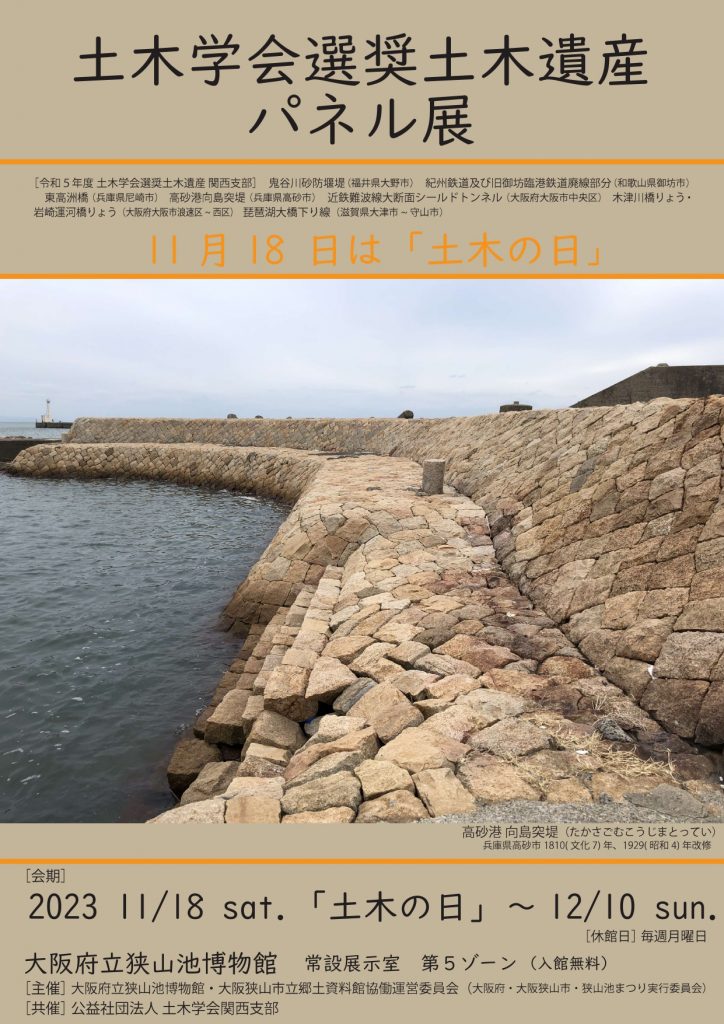 狭山池博物館では、毎年11月18日の「土木の日」に合わせ、土木テーマ展 「選奨土木遺産パネル展」を開催。今回は、令和5年に土木学会関西支部によって認定された選奨遺産のパネル展示を中心に実施。11/18(土)11:00~12:00 には、坂下泰幸さん(一財近畿地域づくり研究所顧問)による展示解説を行う。